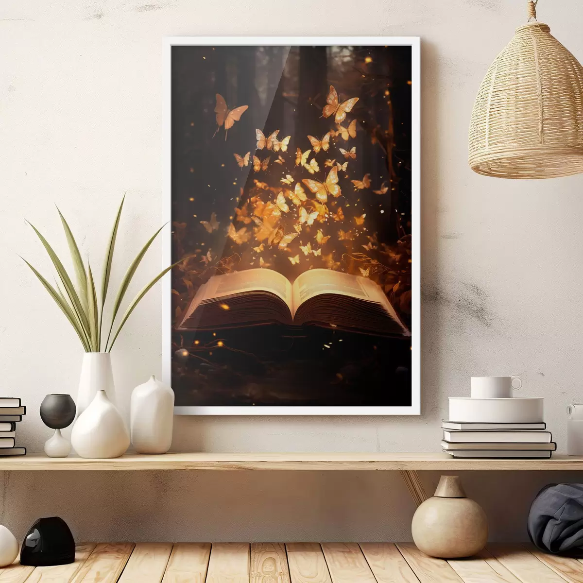 Poster Un libro abierto del que surgen mariposas luminosas que brillan en rayos de luz en un bosque oscuro y mágico. Nr f42573