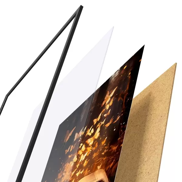 El póster consta de marco, plexiglás, imagen impresa y soporte de aglomerado. El póster puede colgarse inmediatamente en la pared gracias a los soportes de la parte posterior.