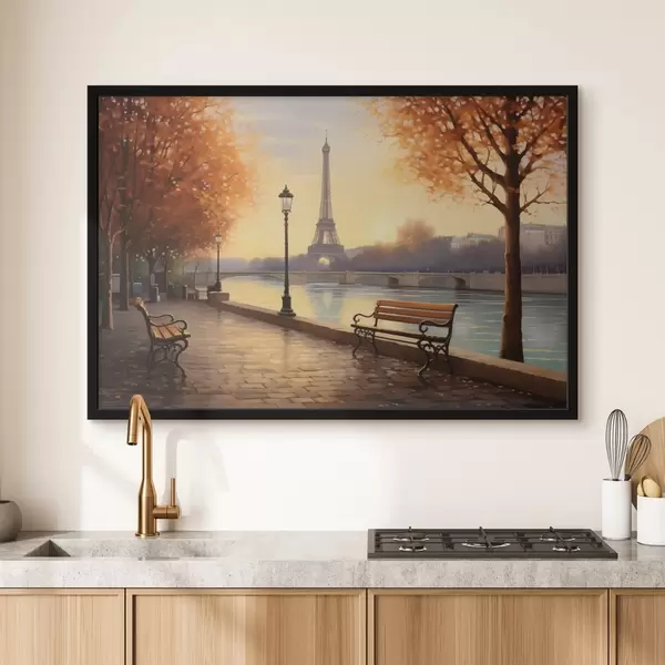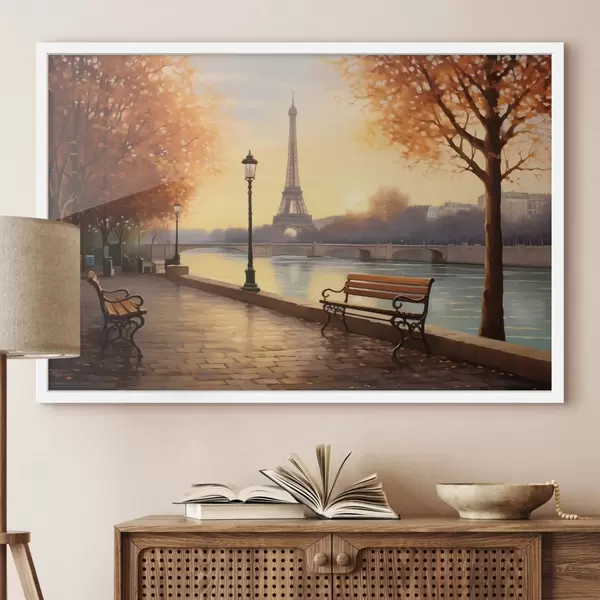 Poster Otoño en París con vistas a la Torre Eiffel, el Sena cubierto de hojas doradas, bancos y farolas que añaden un ambiente romántico. Nr f42577