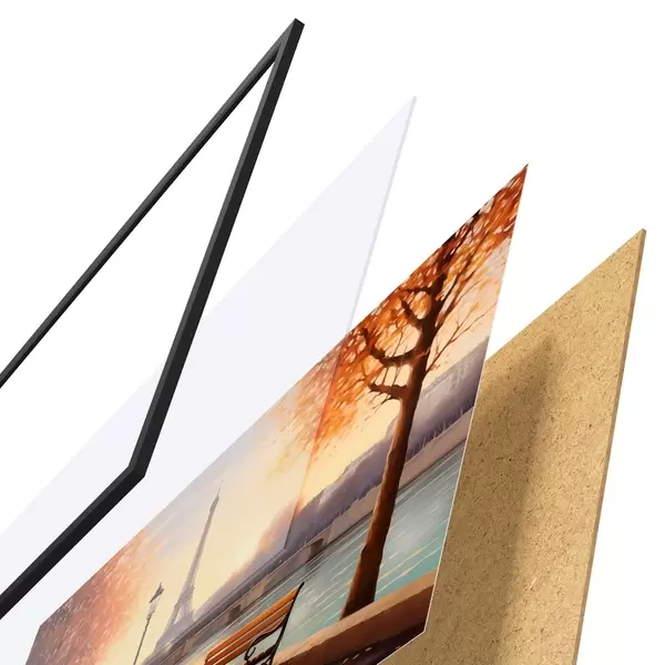El póster consta de marco, plexiglás, imagen impresa y soporte de aglomerado. El póster puede colgarse inmediatamente en la pared gracias a los soportes de la parte posterior.