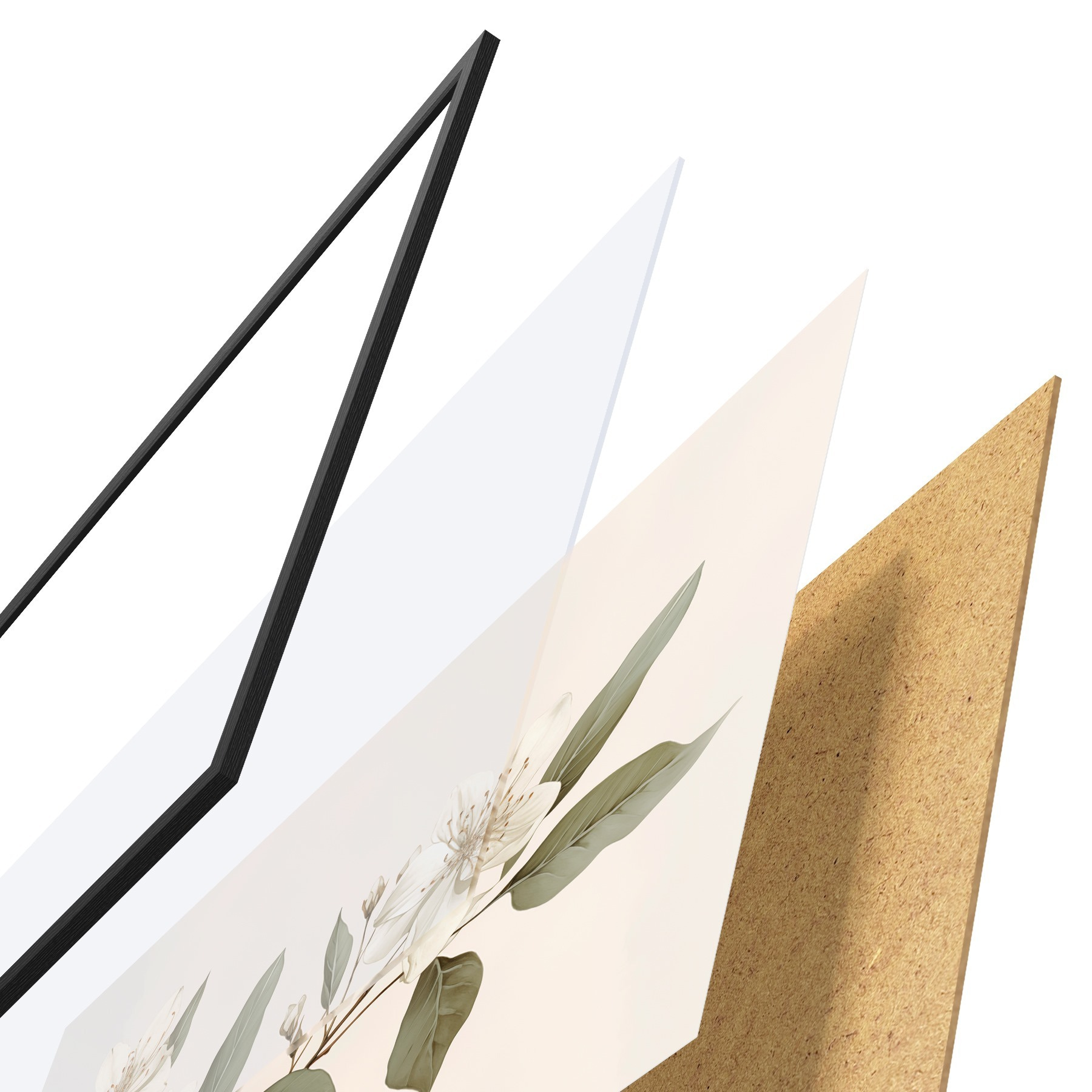 Poster Una delicada rama con flores blancas y hojas verdes sobre un fondo claro, con detalles suaves y un estilo elegante. Nr f42583