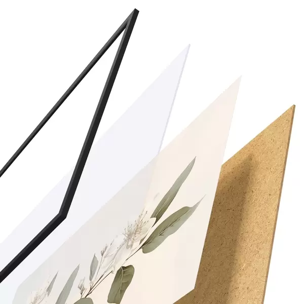 El póster consta de marco, plexiglás, imagen impresa y soporte de aglomerado. El póster puede colgarse inmediatamente en la pared gracias a los soportes de la parte posterior.