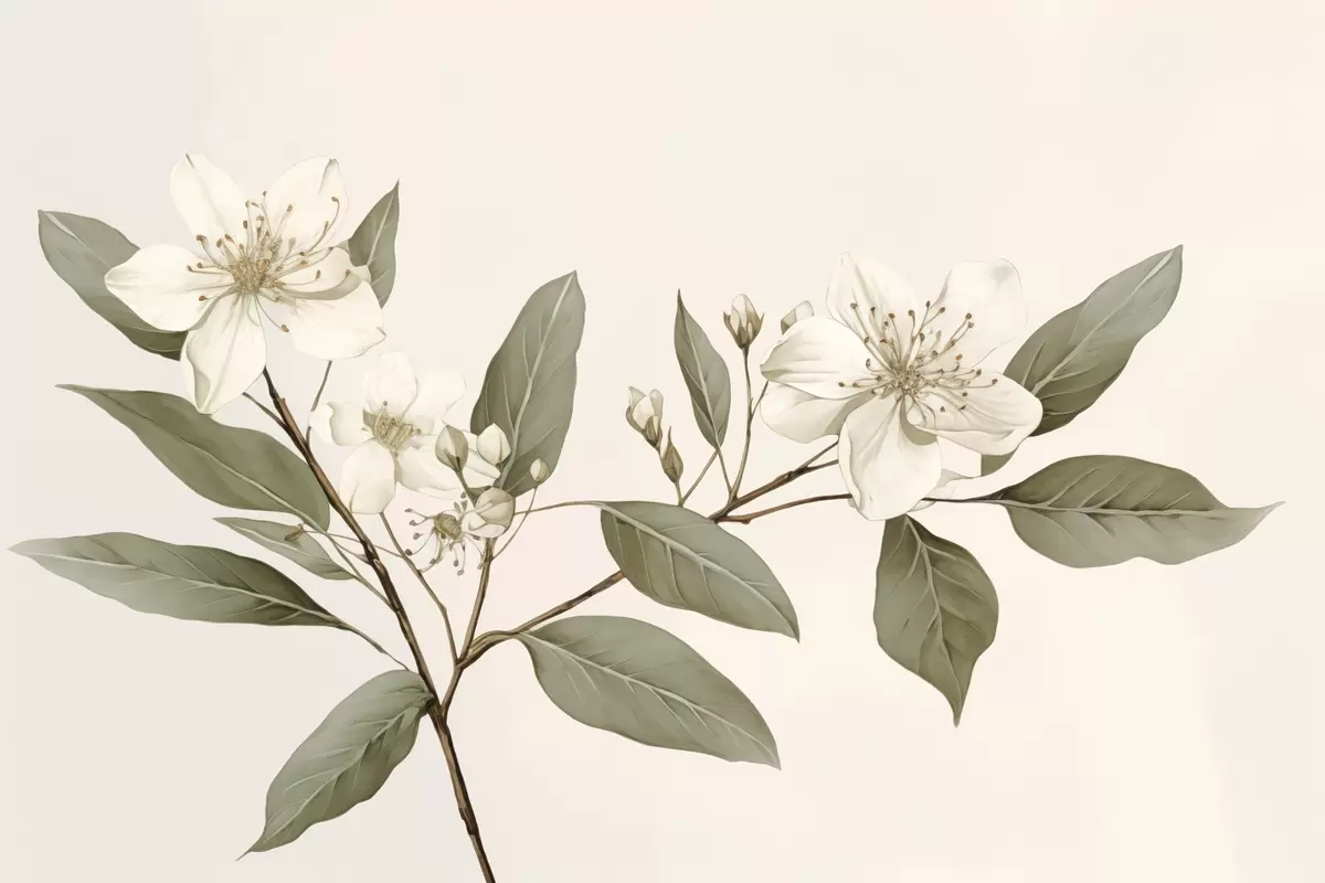 Poster Una delicada rama con flores blancas y hojas verdes sobre un fondo claro, con detalles suaves y un estilo elegante. f42583
