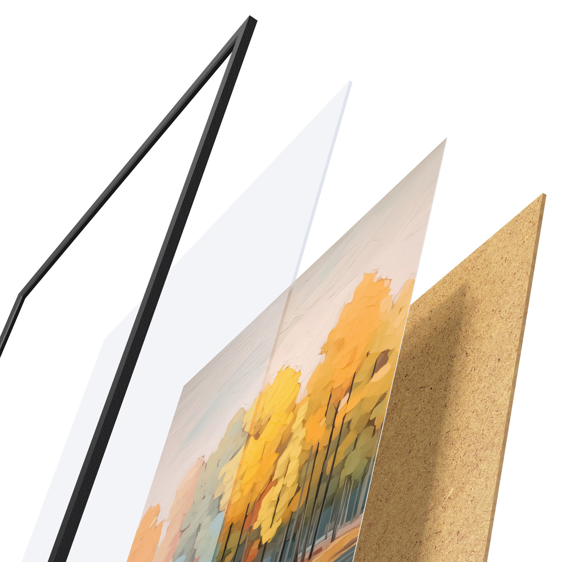 El póster consta de marco, plexiglás, imagen impresa y soporte de aglomerado. El póster puede colgarse inmediatamente en la pared gracias a los soportes de la parte posterior.