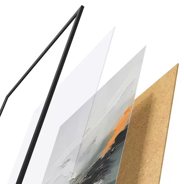 El póster consta de marco, plexiglás, imagen impresa y soporte de aglomerado. El póster puede colgarse inmediatamente en la pared gracias a los soportes de la parte posterior.