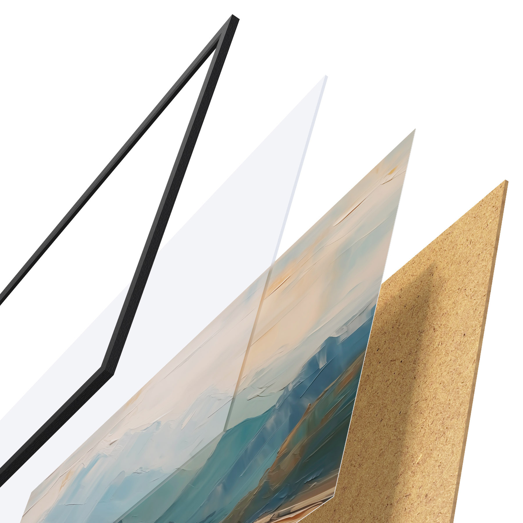 El póster consta de marco, plexiglás, imagen impresa y soporte de aglomerado. El póster puede colgarse inmediatamente en la pared gracias a los soportes de la parte posterior.