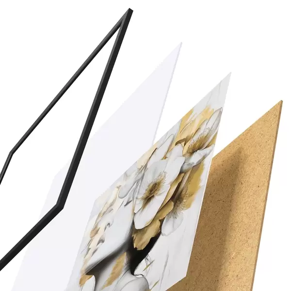 El póster consta de marco, plexiglás, imagen impresa y soporte de aglomerado. El póster puede colgarse inmediatamente en la pared gracias a los soportes de la parte posterior.
