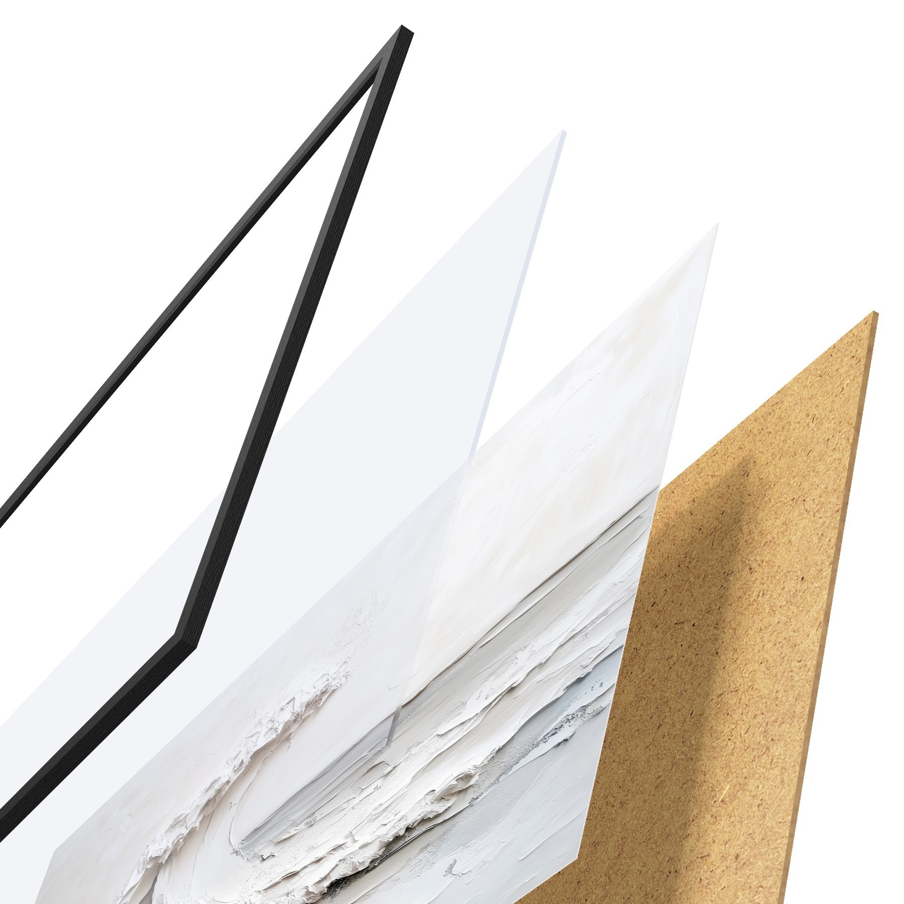 El póster consta de marco, plexiglás, imagen impresa y soporte de aglomerado. El póster puede colgarse inmediatamente en la pared gracias a los soportes de la parte posterior.