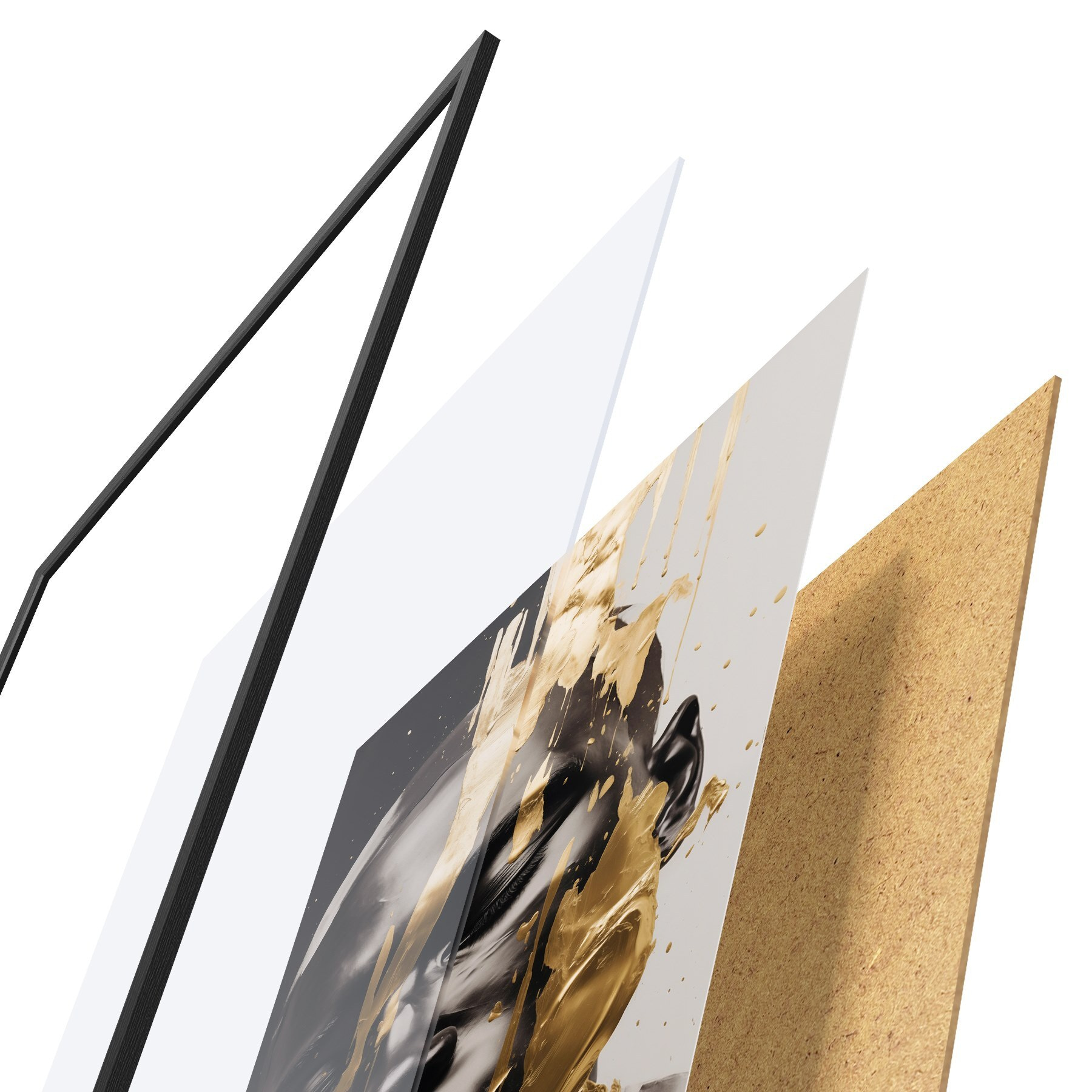 El póster consta de marco, plexiglás, imagen impresa y soporte de aglomerado. El póster puede colgarse inmediatamente en la pared gracias a los soportes de la parte posterior.