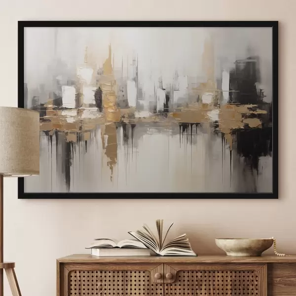 Poster Un paisaje urbano abstracto con reflejos de edificios en el agua, creado en tonos neutros con acentos de tonos cálidos. Nr f42628