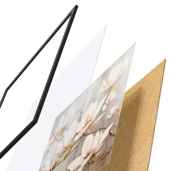 El póster consta de marco, plexiglás, imagen impresa y soporte de aglomerado. El póster puede colgarse inmediatamente en la pared gracias a los soportes de la parte posterior.
