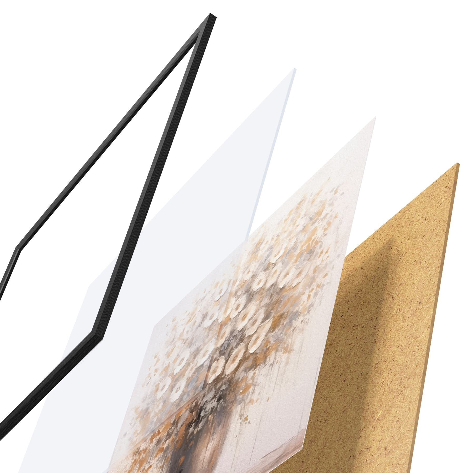 El póster consta de marco, plexiglás, imagen impresa y soporte de aglomerado. El póster puede colgarse inmediatamente en la pared gracias a los soportes de la parte posterior.