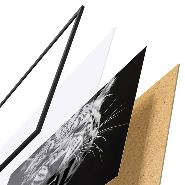 El póster consta de marco, plexiglás, imagen impresa y soporte de aglomerado. El póster puede colgarse inmediatamente en la pared gracias a los soportes de la parte posterior.