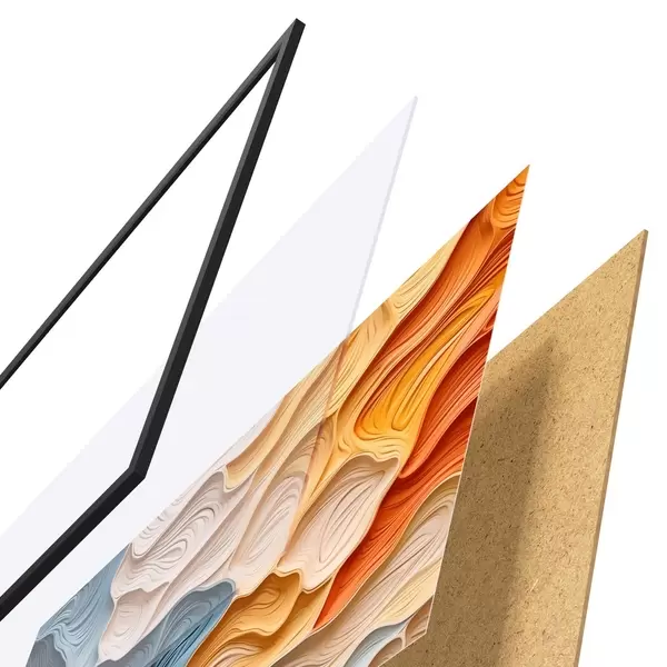 El póster consta de marco, plexiglás, imagen impresa y soporte de aglomerado. El póster puede colgarse inmediatamente en la pared gracias a los soportes de la parte posterior.