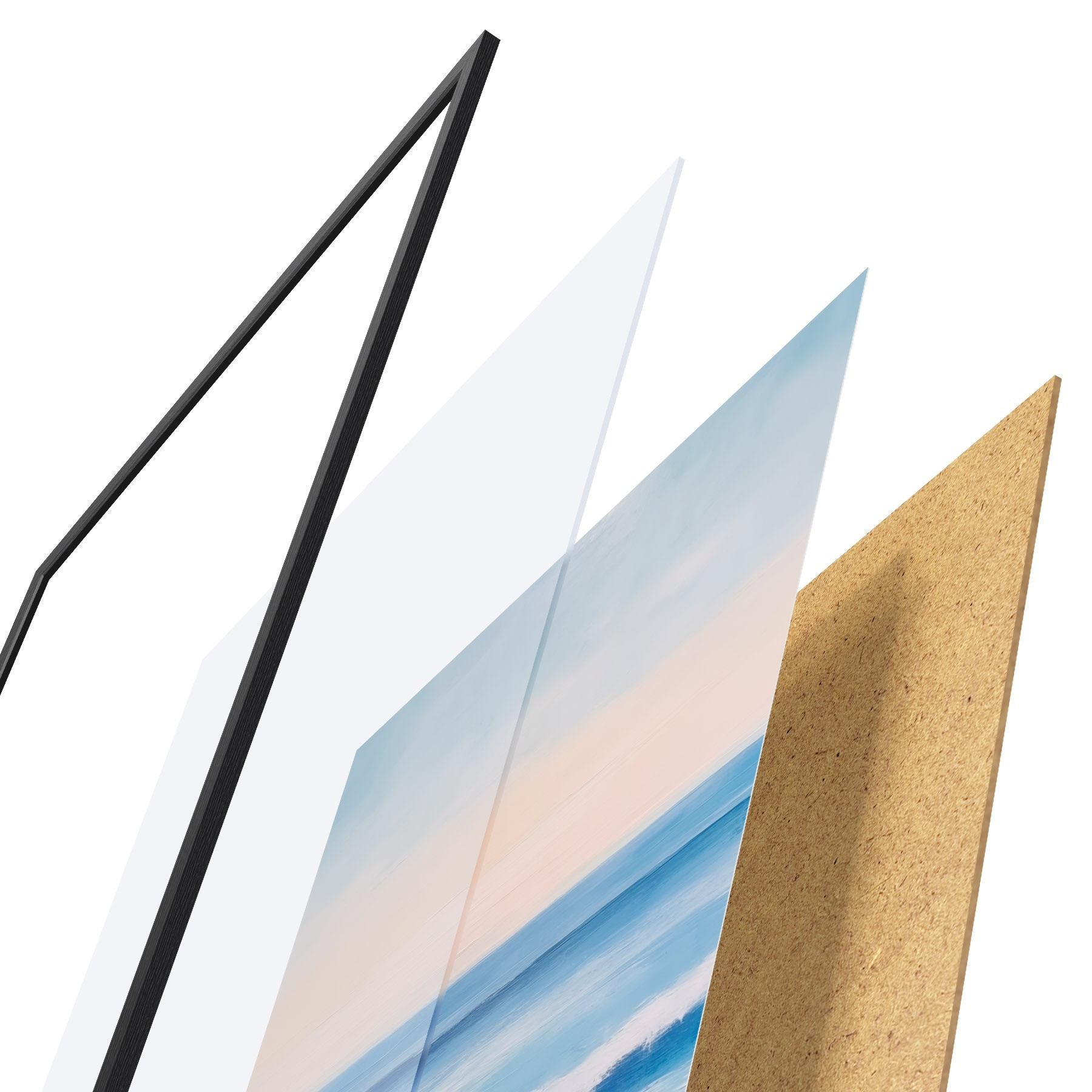 El póster consta de marco, plexiglás, imagen impresa y soporte de aglomerado. El póster puede colgarse inmediatamente en la pared gracias a los soportes de la parte posterior.