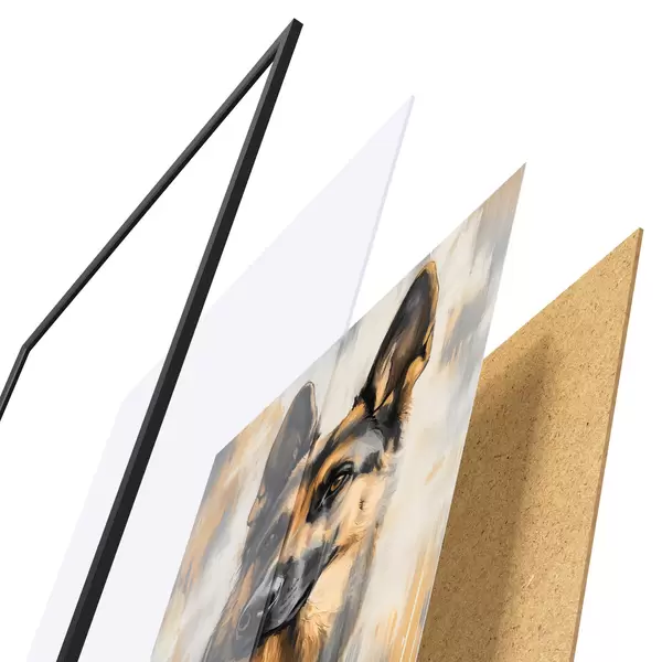 El póster consta de marco, plexiglás, imagen impresa y soporte de aglomerado. El póster puede colgarse inmediatamente en la pared gracias a los soportes de la parte posterior.