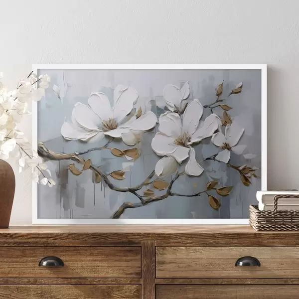 Poster Flores de magnolia blanca con pétalos texturizados y hojas marrones sobre un fondo azul suave imitación pintura al óleo f42711