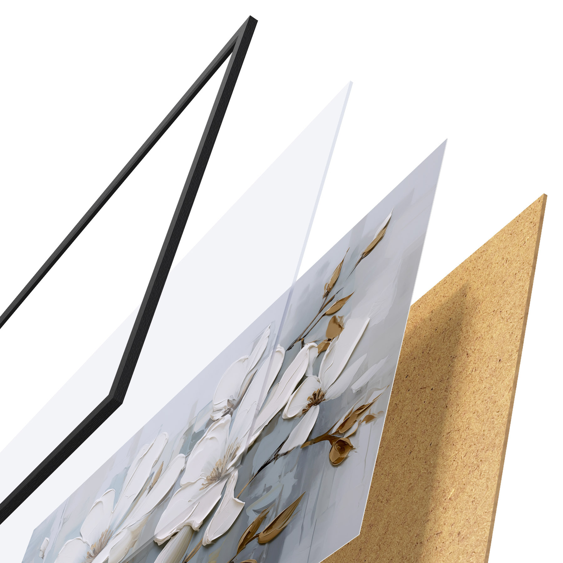El póster consta de marco, plexiglás, imagen impresa y soporte de aglomerado. El póster puede colgarse inmediatamente en la pared gracias a los soportes de la parte posterior.