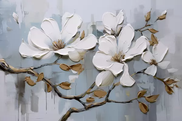 Poster Flores de magnolia blanca con pétalos texturizados y hojas marrones sobre un fondo azul suave imitación pintura al óleo Nr f42711