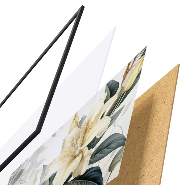 El póster consta de marco, plexiglás, imagen impresa y soporte de aglomerado. El póster puede colgarse inmediatamente en la pared gracias a los soportes de la parte posterior.