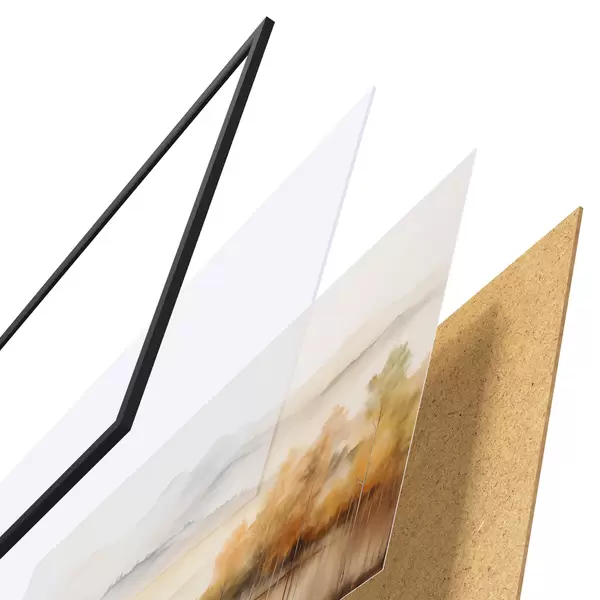 El póster consta de marco, plexiglás, imagen impresa y soporte de aglomerado. El póster puede colgarse inmediatamente en la pared gracias a los soportes de la parte posterior.