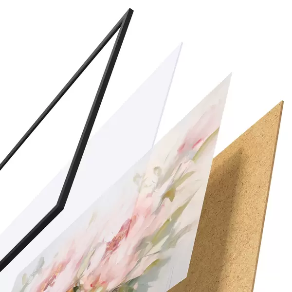El póster consta de marco, plexiglás, imagen impresa y soporte de aglomerado. El póster puede colgarse inmediatamente en la pared gracias a los soportes de la parte posterior.