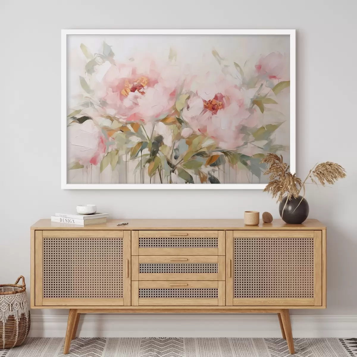 Poster Pintura al óleo imitación de grandes peonías rosas con pétalos suaves y centros amarillos, rodeadas de hojas verdes f42720