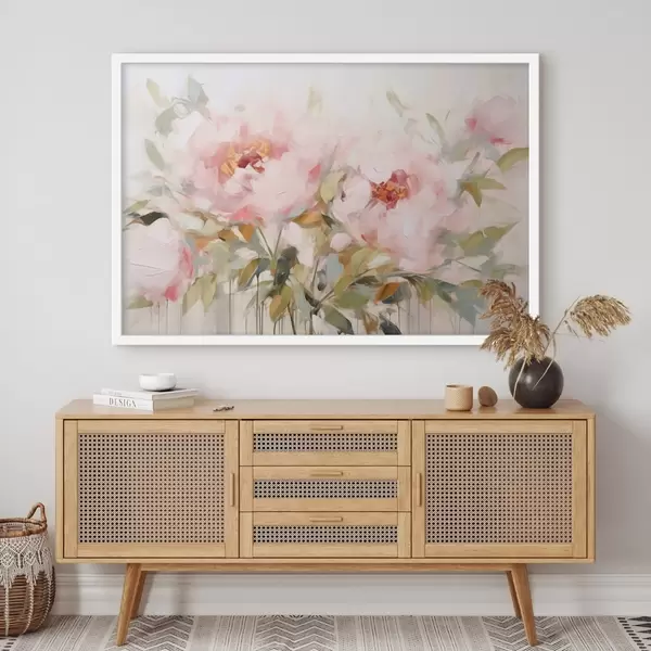 Poster Pintura al óleo imitación de grandes peonías rosas con pétalos suaves y centros amarillos, rodeadas de hojas verdes Nr f42720