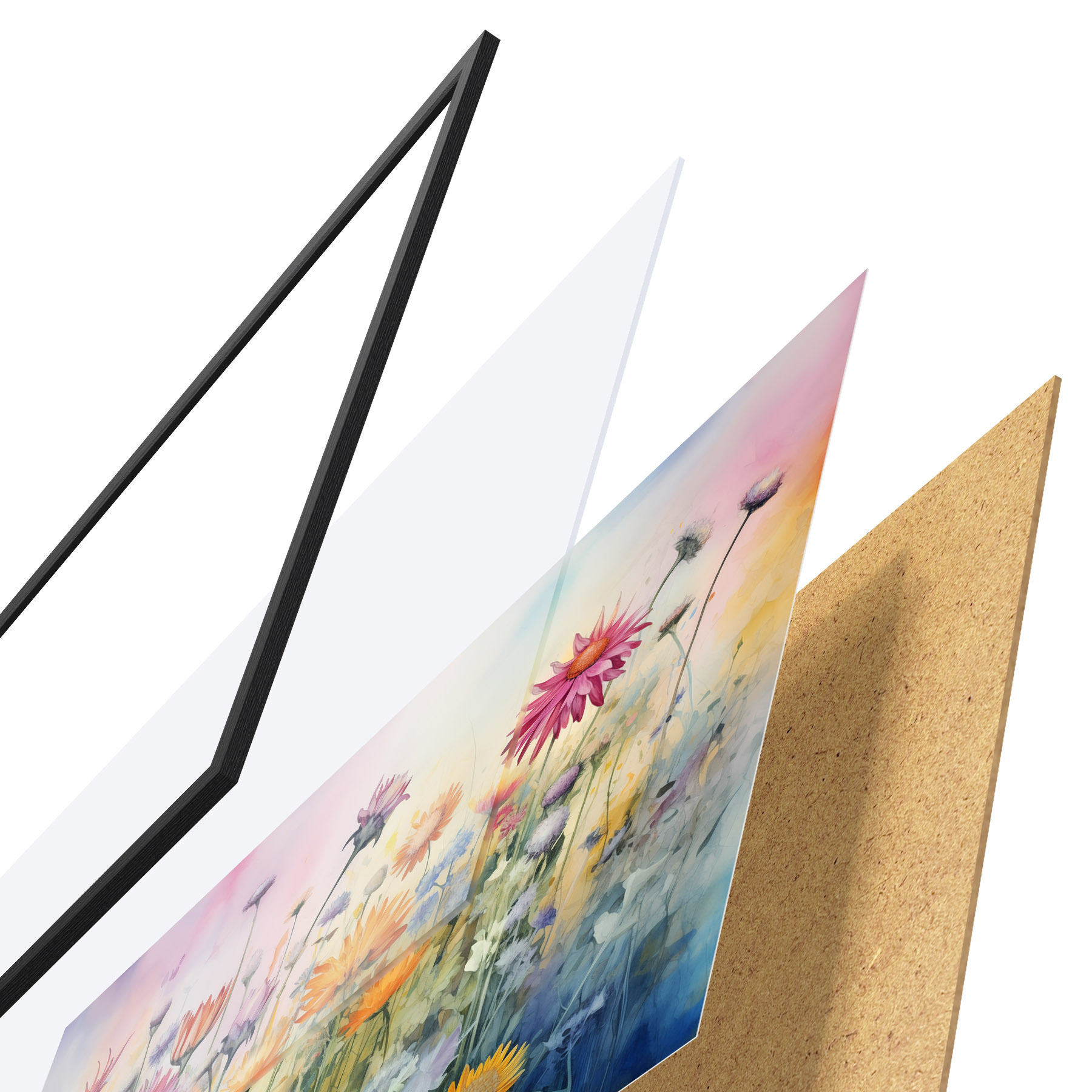 El póster consta de marco, plexiglás, imagen impresa y soporte de aglomerado. El póster puede colgarse inmediatamente en la pared gracias a los soportes de la parte posterior.