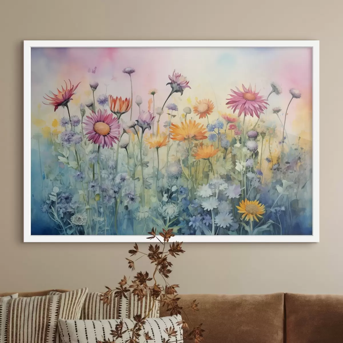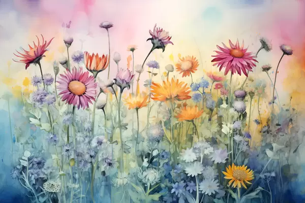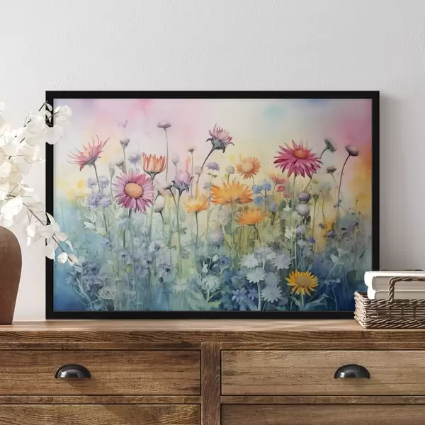 Poster Un vibrante campo de altas y exuberantes flores silvestres sobre un suave fondo de acuarela en tonos pastel Nr f42726