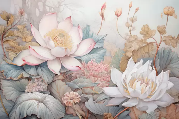 Poster Grandes flores de loto en tonos rosas y blancos, rodeadas de hojas verdes y un delicado follaje rosa Nr f42729