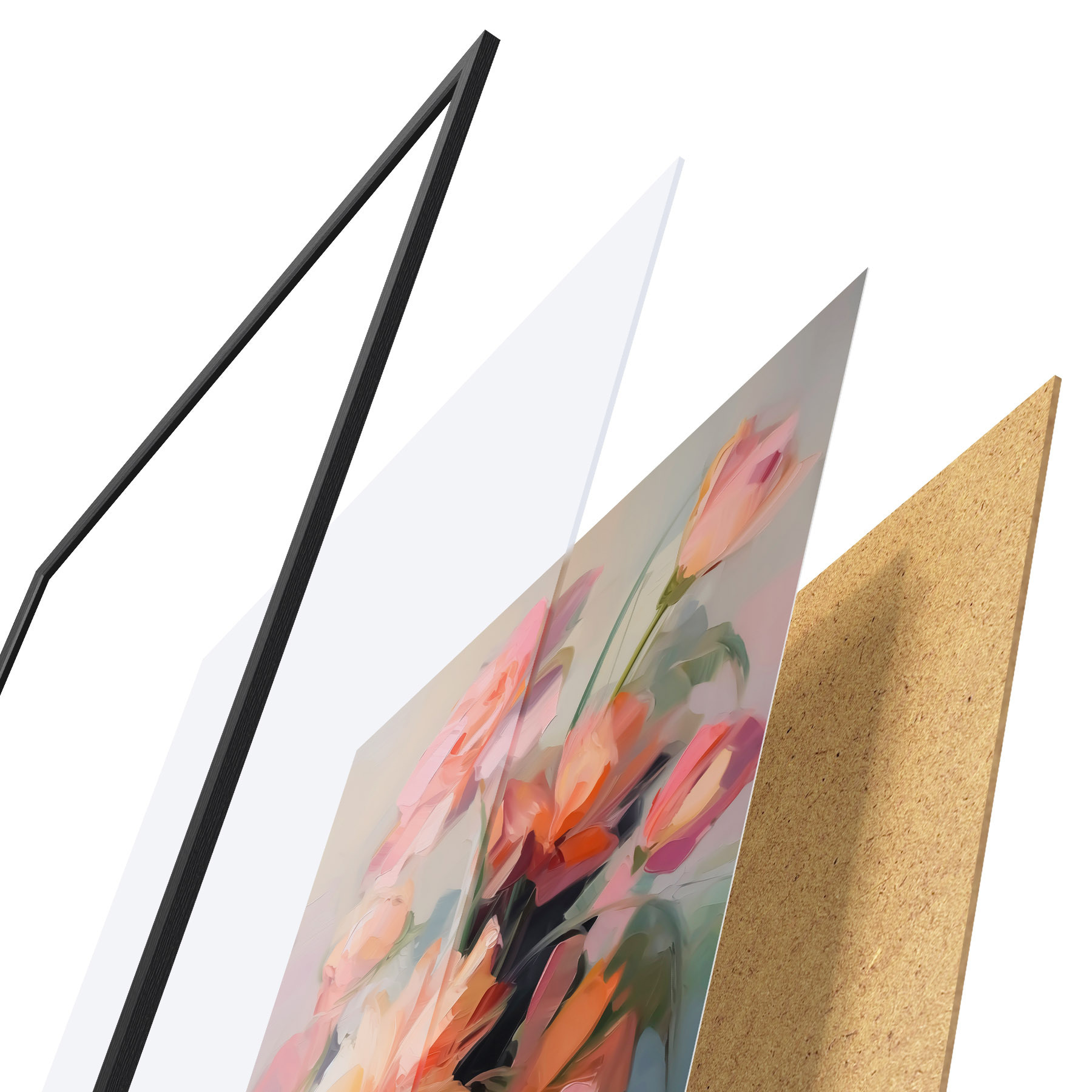 El póster consta de marco, plexiglás, imagen impresa y soporte de aglomerado. El póster puede colgarse inmediatamente en la pared gracias a los soportes de la parte posterior.