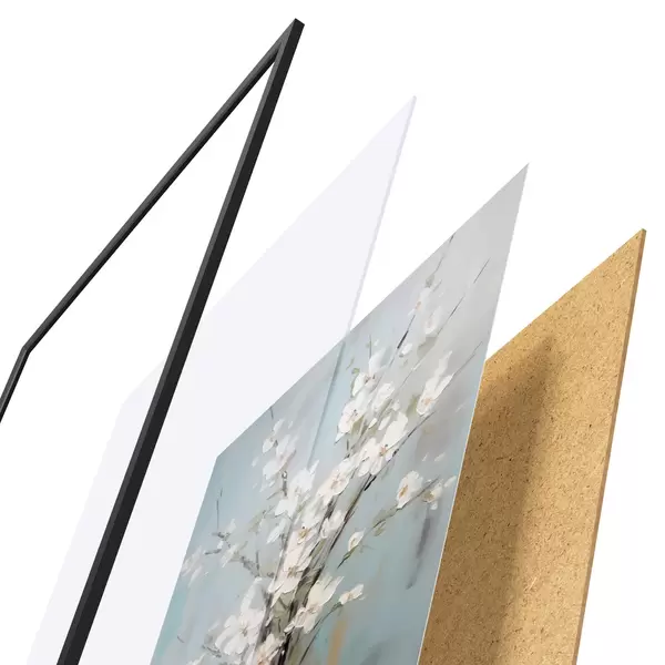 El póster consta de marco, plexiglás, imagen impresa y soporte de aglomerado. El póster puede colgarse inmediatamente en la pared gracias a los soportes de la parte posterior.