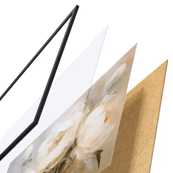 El póster consta de marco, plexiglás, imagen impresa y soporte de aglomerado. El póster puede colgarse inmediatamente en la pared gracias a los soportes de la parte posterior.