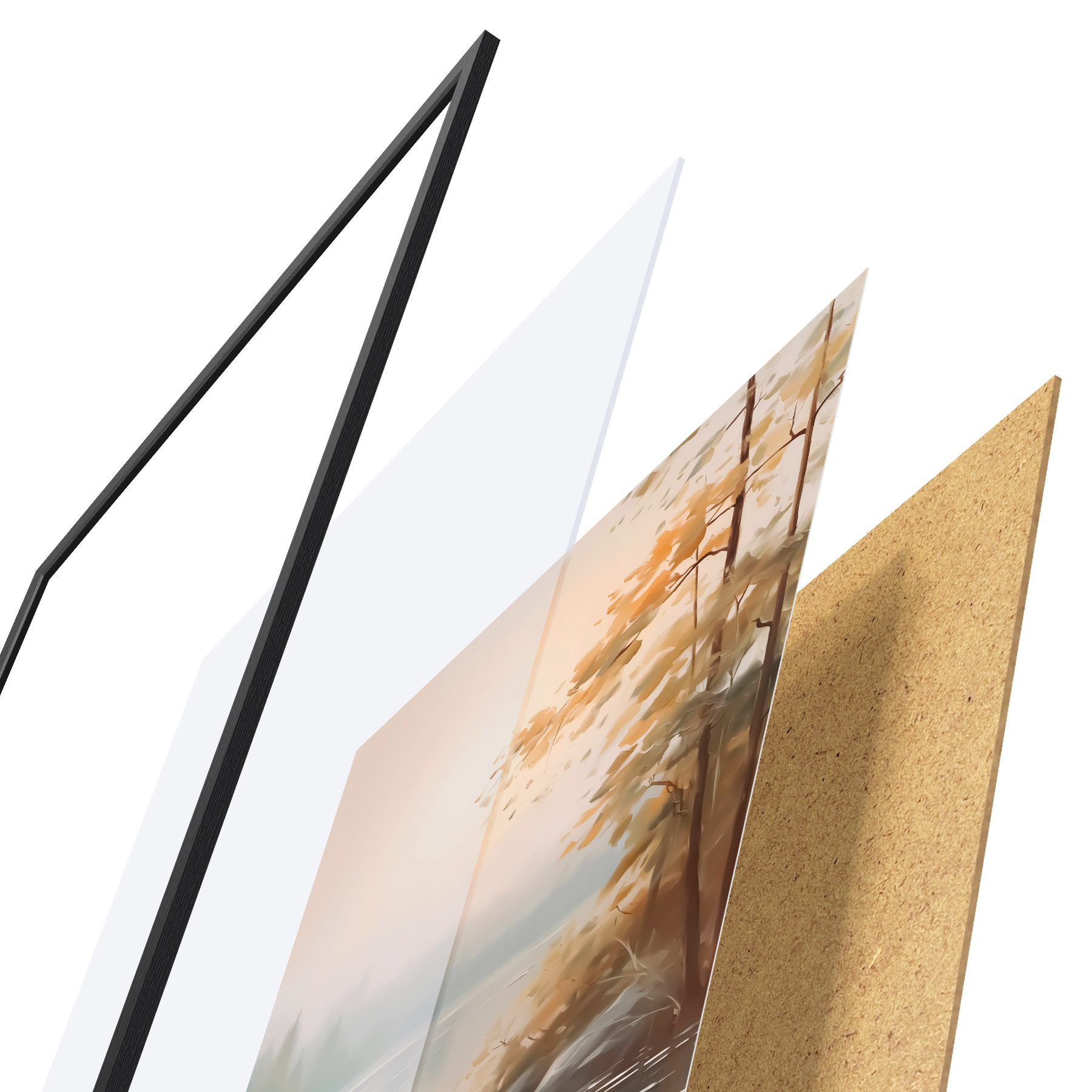 El póster consta de marco, plexiglás, imagen impresa y soporte de aglomerado. El póster puede colgarse inmediatamente en la pared gracias a los soportes de la parte posterior.