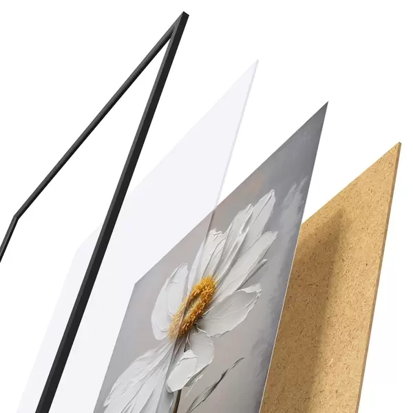 El póster consta de marco, plexiglás, imagen impresa y soporte de aglomerado. El póster puede colgarse inmediatamente en la pared gracias a los soportes de la parte posterior.