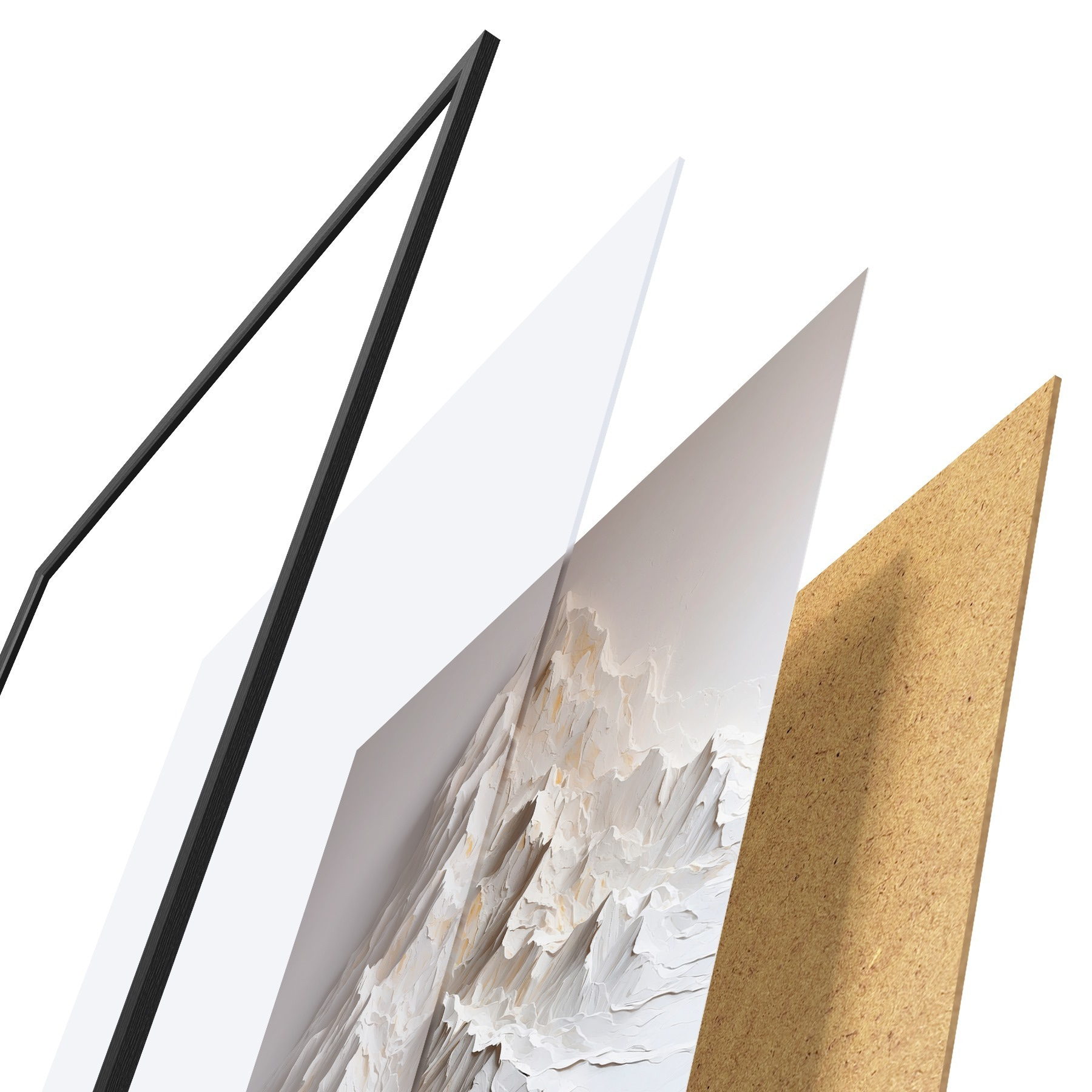 El póster consta de marco, plexiglás, imagen impresa y soporte de aglomerado. El póster puede colgarse inmediatamente en la pared gracias a los soportes de la parte posterior.