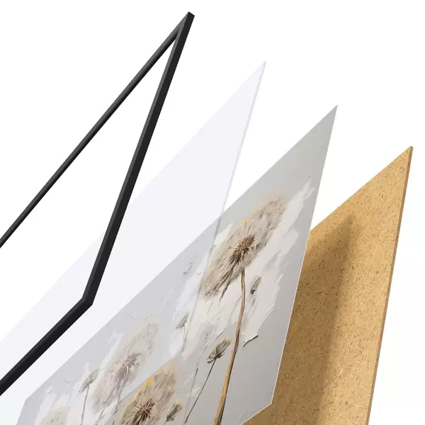 El póster consta de marco, plexiglás, imagen impresa y soporte de aglomerado. El póster puede colgarse inmediatamente en la pared gracias a los soportes de la parte posterior.