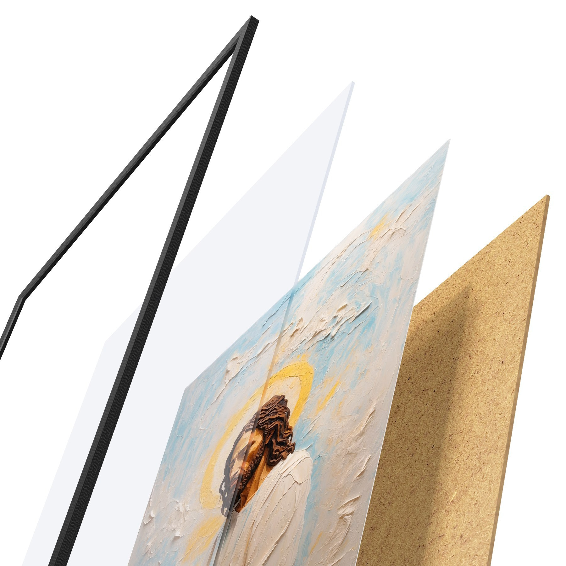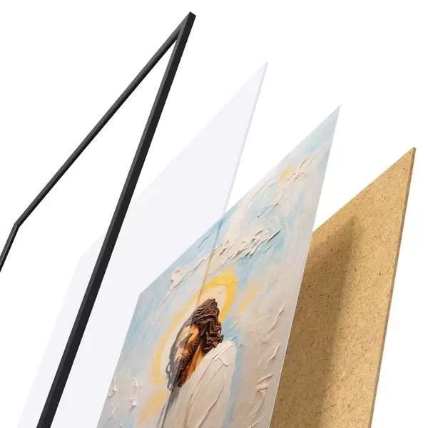 El póster consta de marco, plexiglás, imagen impresa y soporte de aglomerado. El póster puede colgarse inmediatamente en la pared gracias a los soportes de la parte posterior.