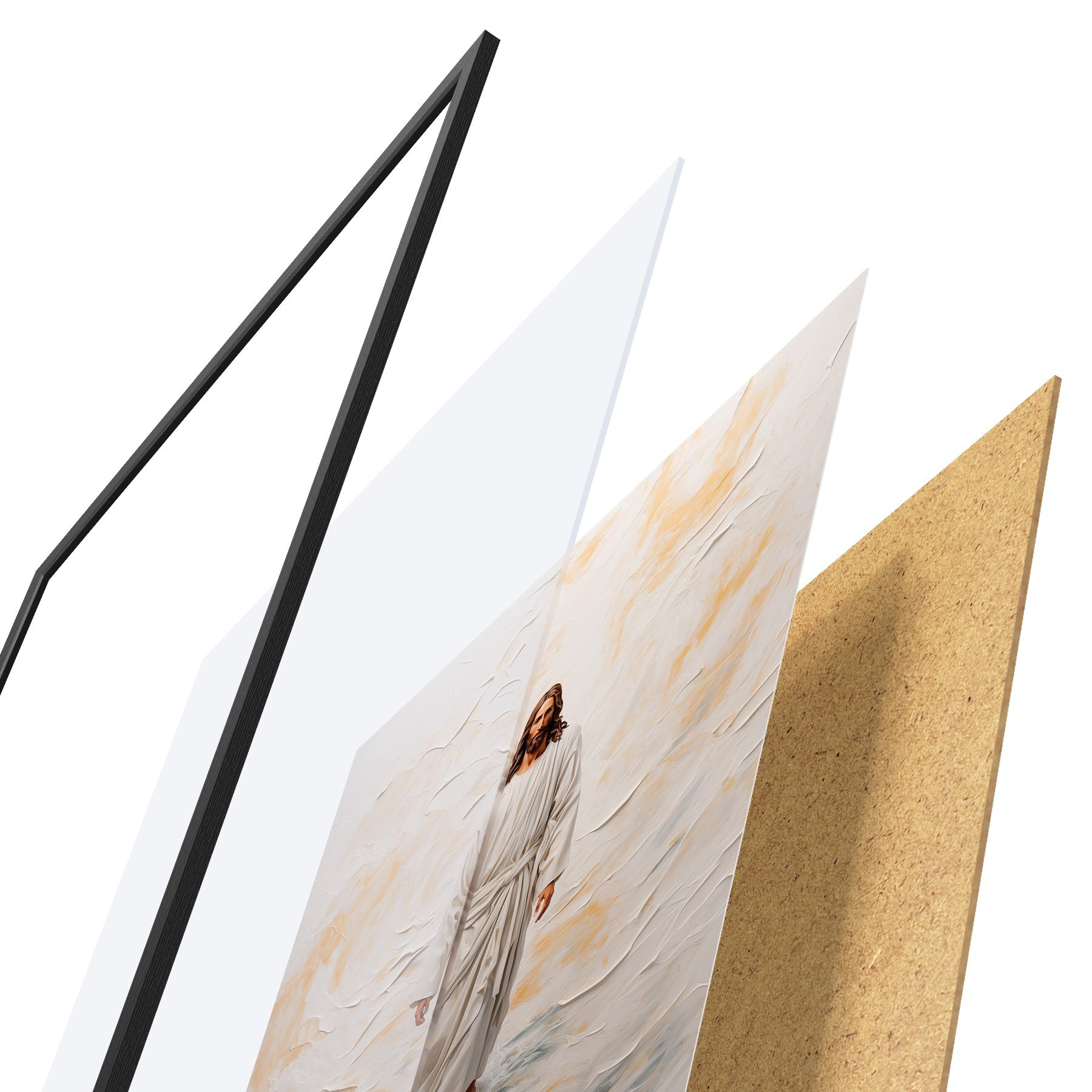 El póster consta de marco, plexiglás, imagen impresa y soporte de aglomerado. El póster puede colgarse inmediatamente en la pared gracias a los soportes de la parte posterior.
