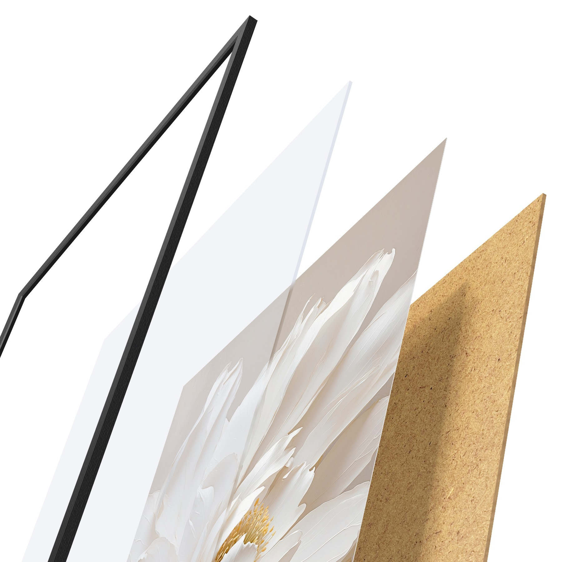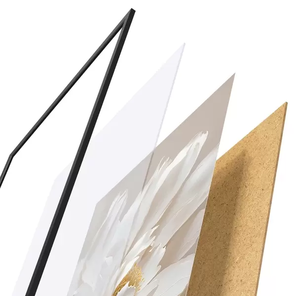 El póster consta de marco, plexiglás, imagen impresa y soporte de aglomerado. El póster puede colgarse inmediatamente en la pared gracias a los soportes de la parte posterior.
