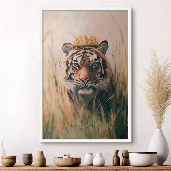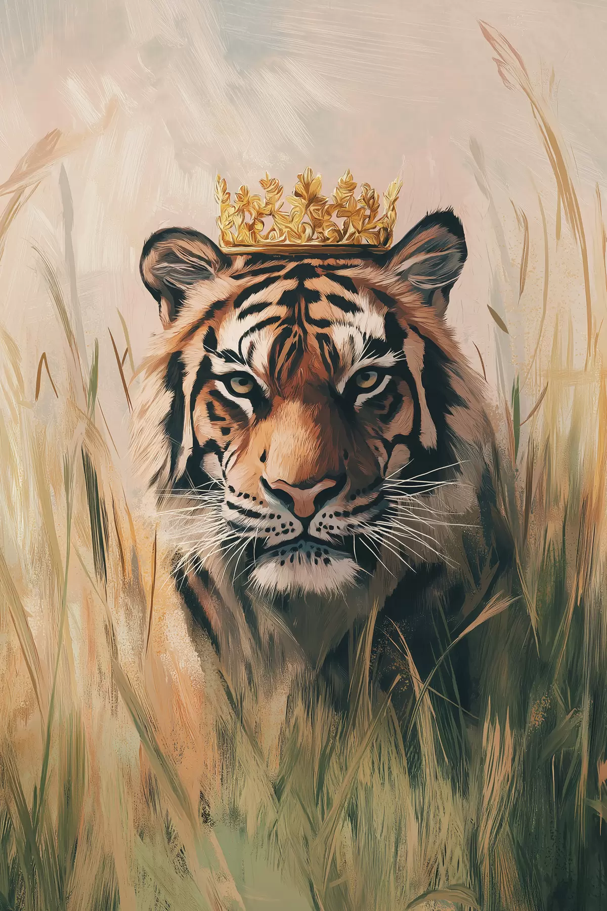 Poster Tigre en el prado con hierba, corona dorada, dibujo estilo acrílico Nr f42783