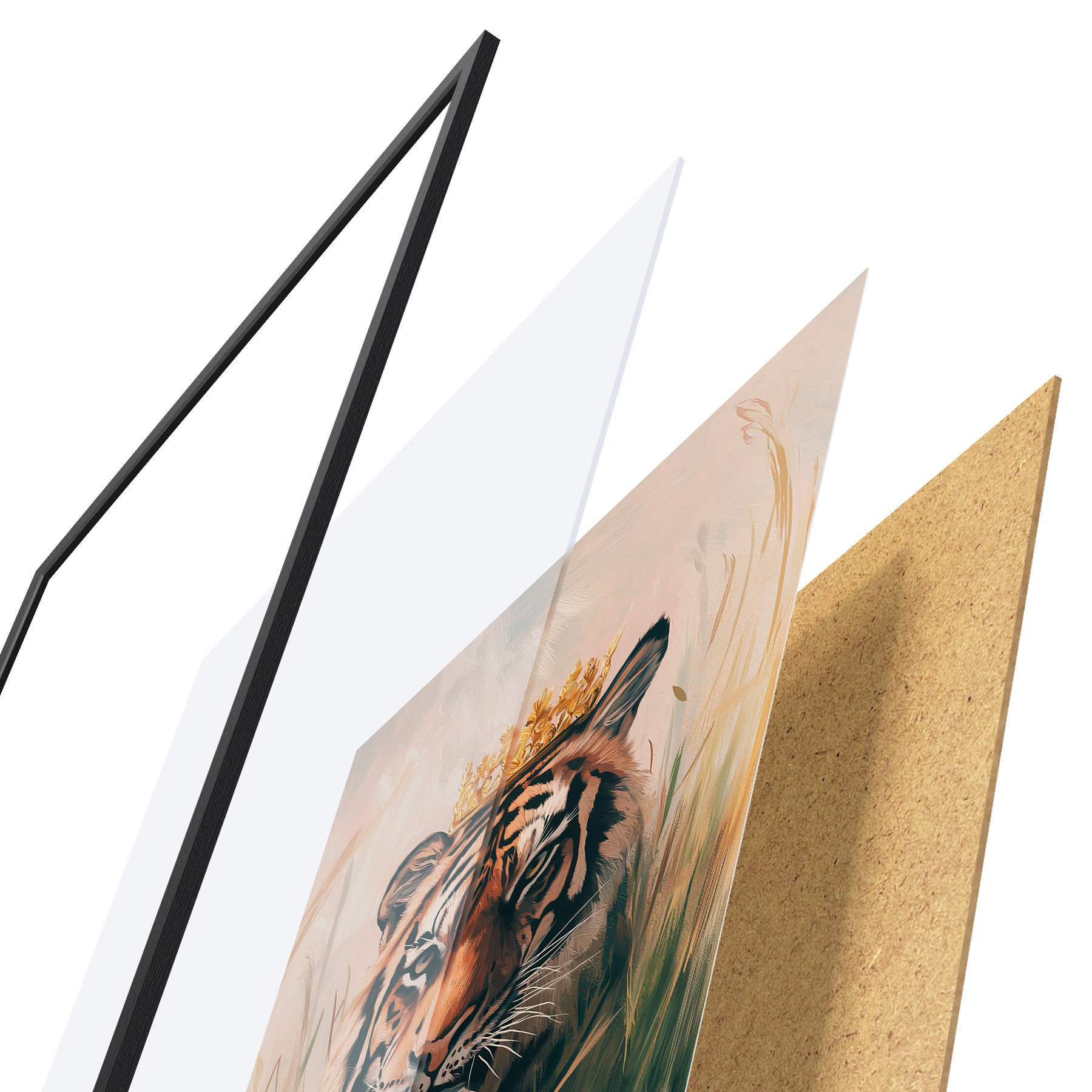 El póster consta de marco, plexiglás, imagen impresa y soporte de aglomerado. El póster puede colgarse inmediatamente en la pared gracias a los soportes de la parte posterior.
