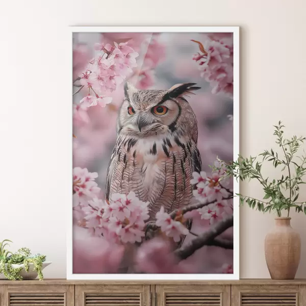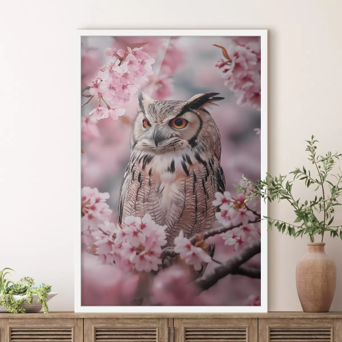 Poster Hermoso búho en la rama de un cerezo, naturaleza, realismo Nr f42784