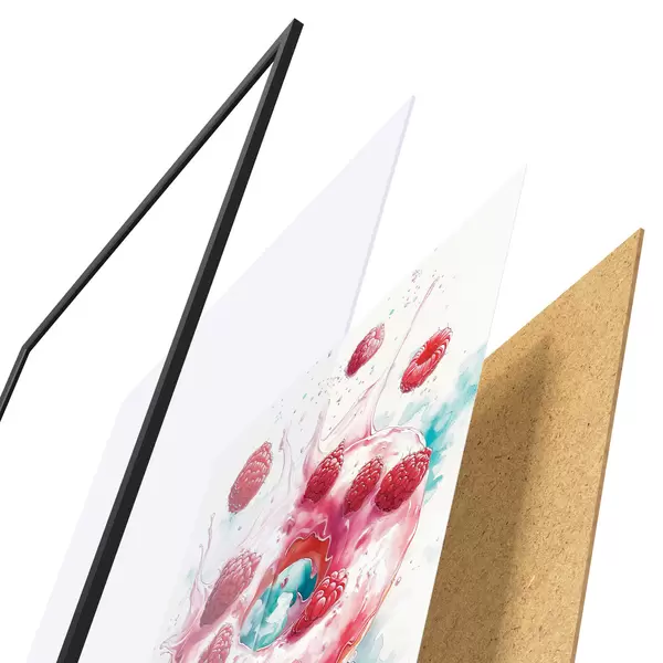 El póster consta de marco, plexiglás, imagen impresa y soporte de aglomerado. El póster puede colgarse inmediatamente en la pared gracias a los soportes de la parte posterior.