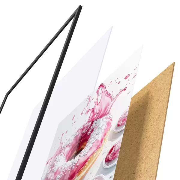 El póster consta de marco, plexiglás, imagen impresa y soporte de aglomerado. El póster puede colgarse inmediatamente en la pared gracias a los soportes de la parte posterior.