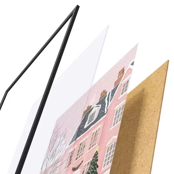 El póster consta de marco, plexiglás, imagen impresa y soporte de aglomerado. El póster puede colgarse inmediatamente en la pared gracias a los soportes de la parte posterior.