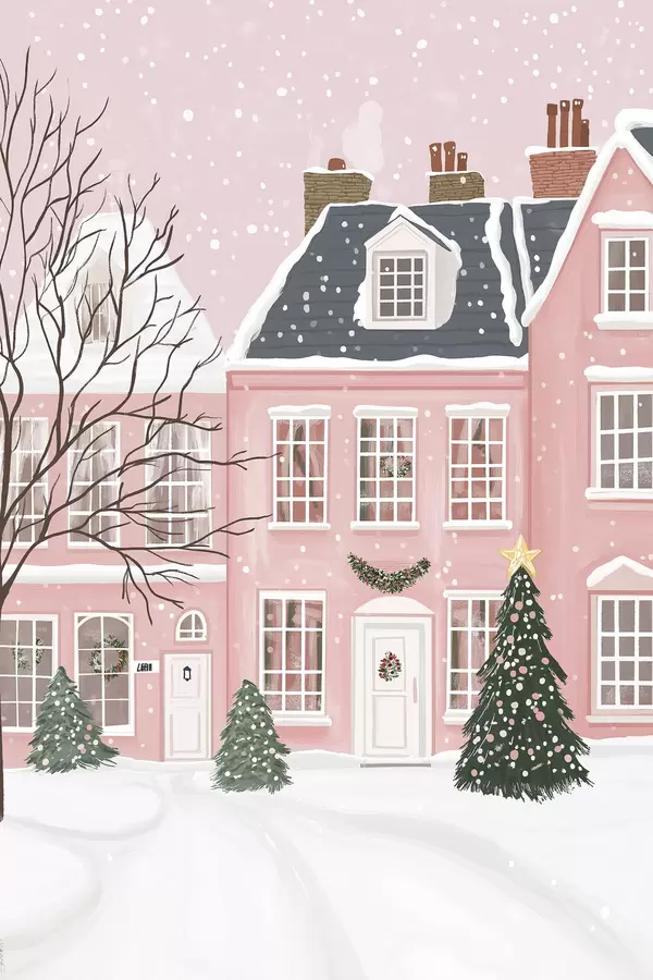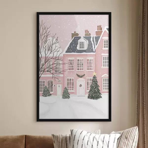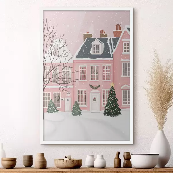 Poster Bonitas casas rosas, pinos, paisajes invernales f42791