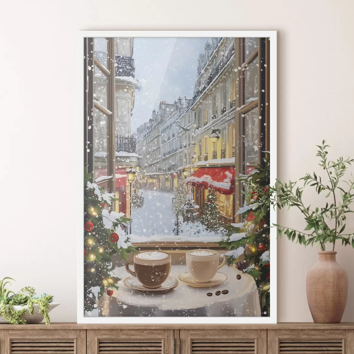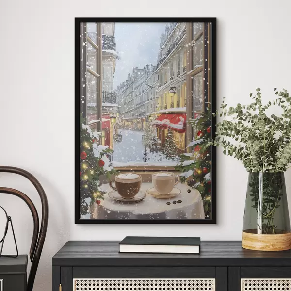 Poster Acogedora cafetería de invierno, tazas de café, estilo acrílico, arquitectura antigua de la ciudad Nr f42795