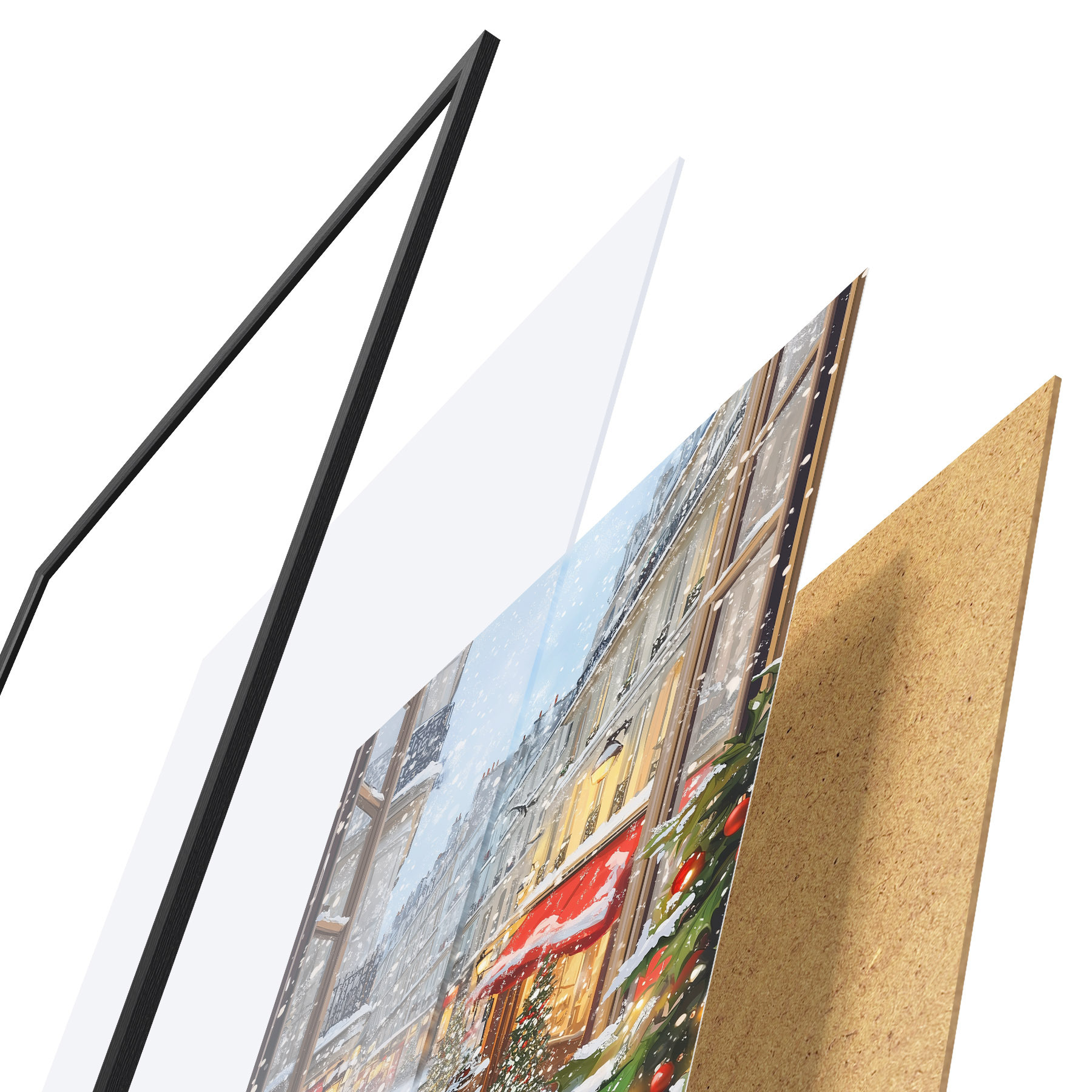 El póster consta de marco, plexiglás, imagen impresa y soporte de aglomerado. El póster puede colgarse inmediatamente en la pared gracias a los soportes de la parte posterior.